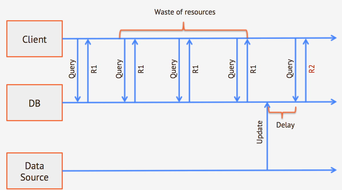 The client does not know when changes are made. In order to get updates, it must constantly execute polling queries. This can lead to wasted resources, especially in the case where the poll requires long-running or otherwise intensive queries.