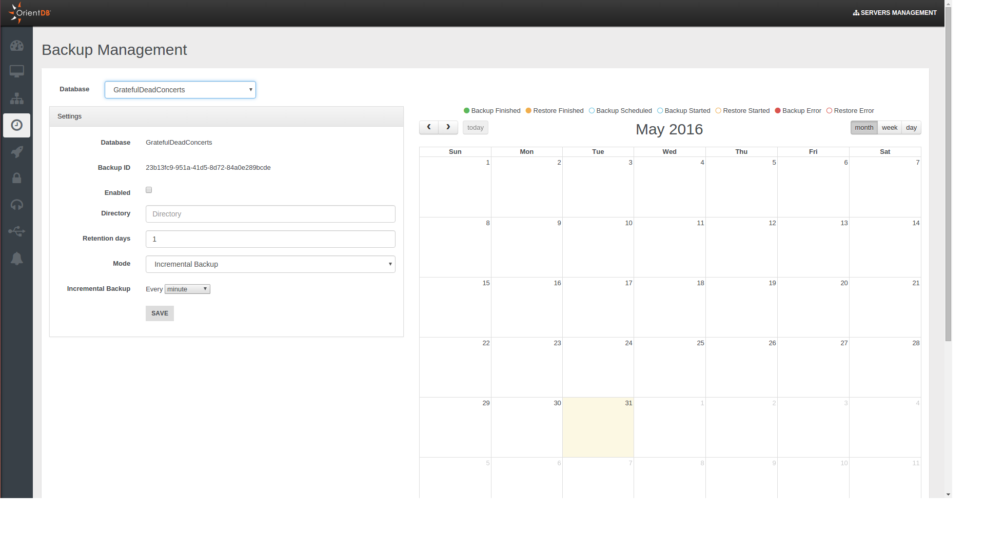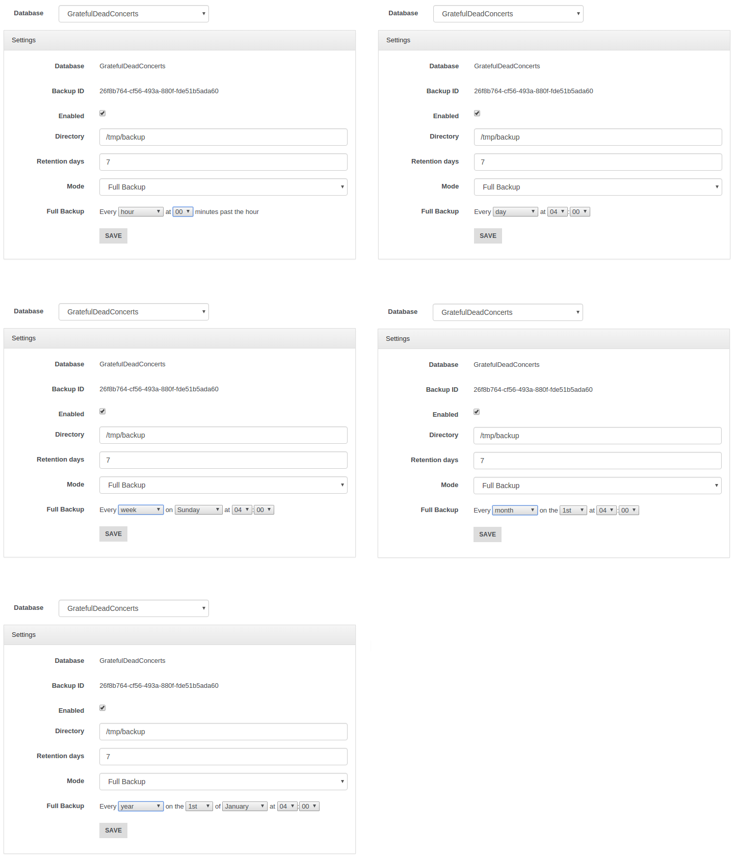 In this way we can have a "checkpoint" for each different directory to use in order to restore the database to a specific moment. You can decide if delete or maintain old backups and for each of them you can exploit the incremental backup features at the same time. To achieve this goal and use this feature properly mind that full backup period must be major than incremental backup period, different settings may cause illogical behaviours.