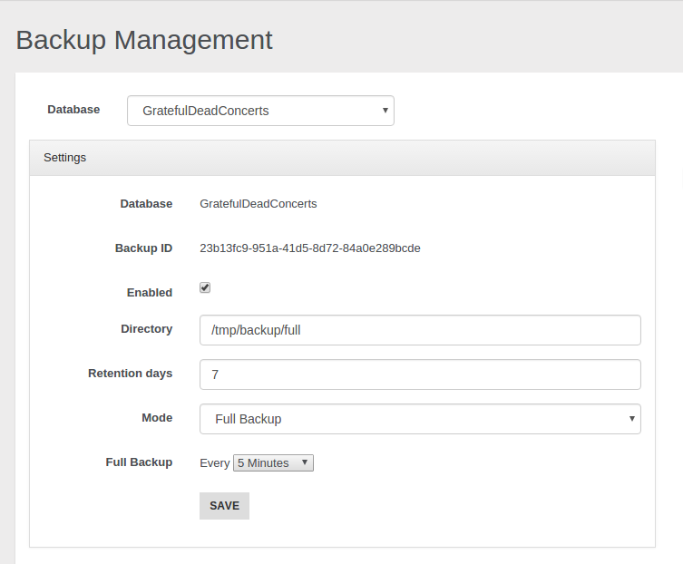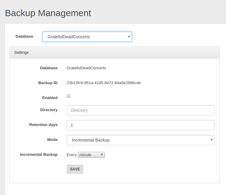 As first thing choose the database that you want backup. In the example above we have chosen the GratefulDeadConcerts database. Then you must specify the output directory where you want to save your backups and the retention days of your backups. Now you must select the backup mode you want to use: