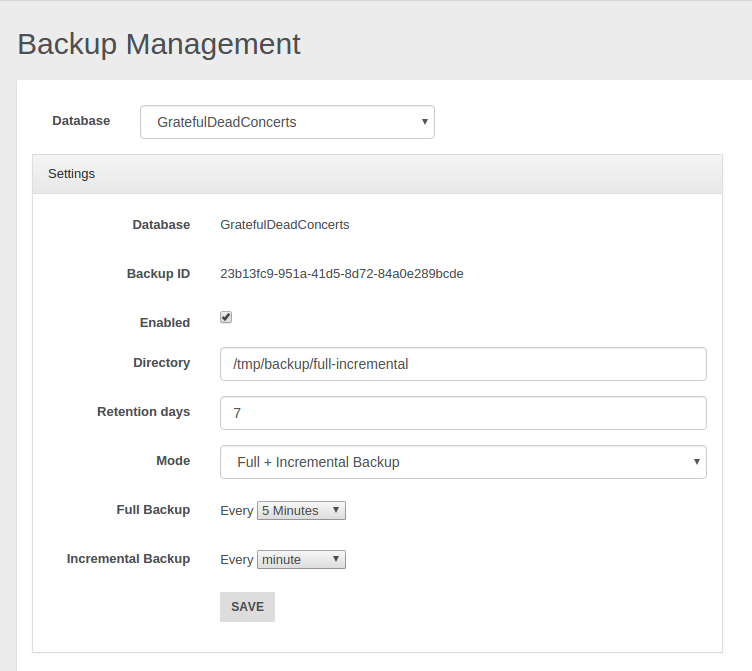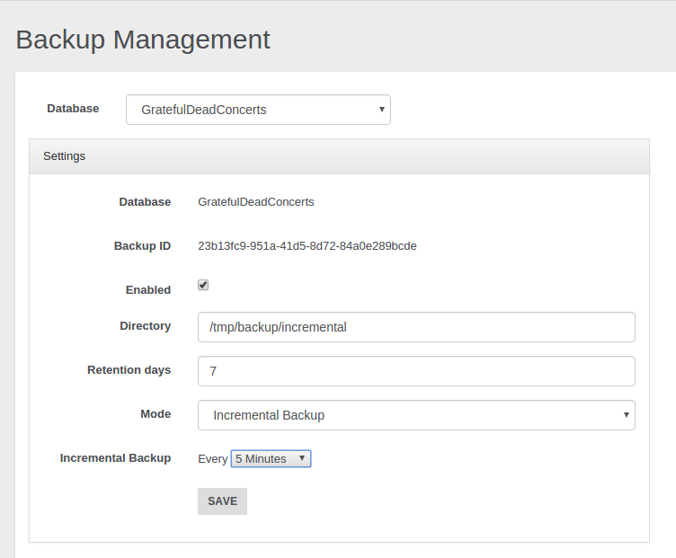 If you prefer to execute an incremental backup you can select this mode. As declared in the Incremental Backup page the incremental backup generates smaller backup files by storing only the delta between two versions of the database. Let's suppose we want execute a backup every 5 minutes: a first full backup will be performed, then it will be followed by a new incremental backup, containing only the delta, every 5 minutes.