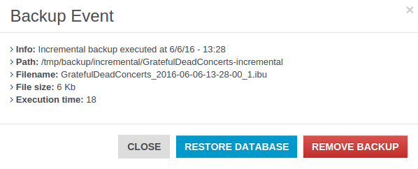 Clicking on a backup you can examine additional info like execution time and timestamp, directory path, file name and file size.