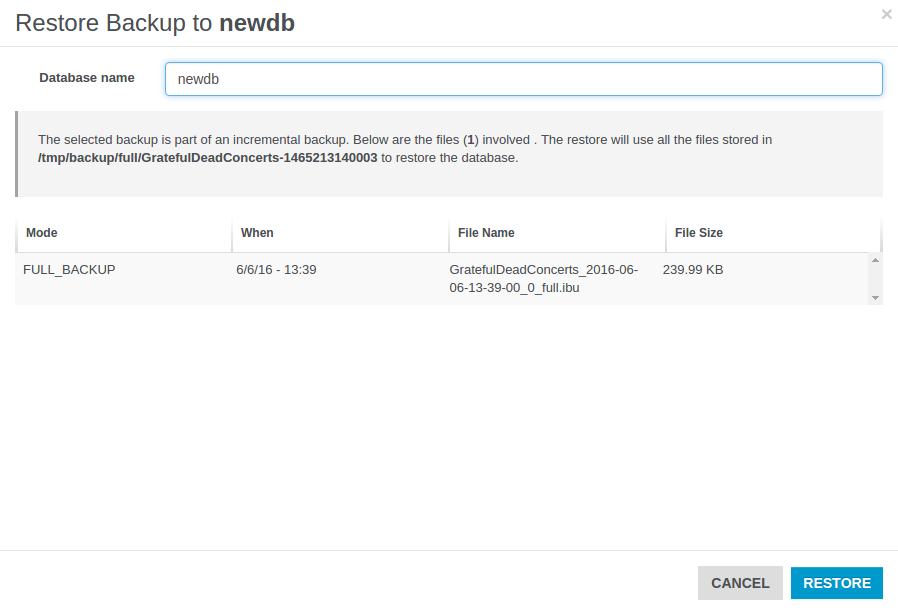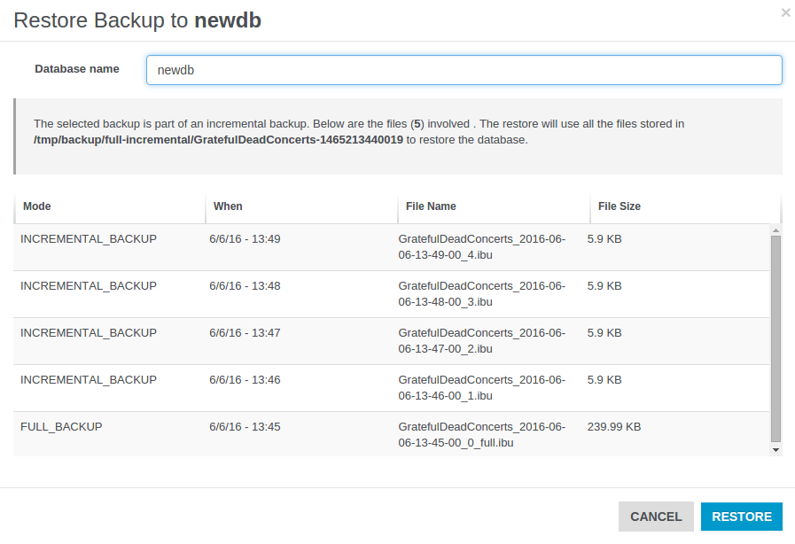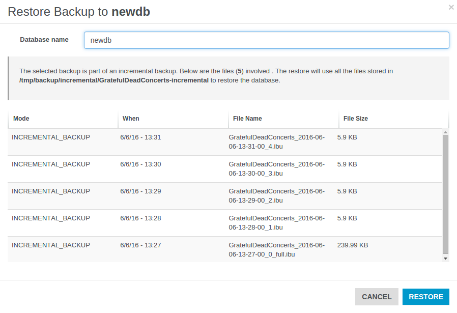 Below are reported all the files involved in the restore procedure: the number of files used to restore your database depends on the backup mode you chose for the selected backup task.