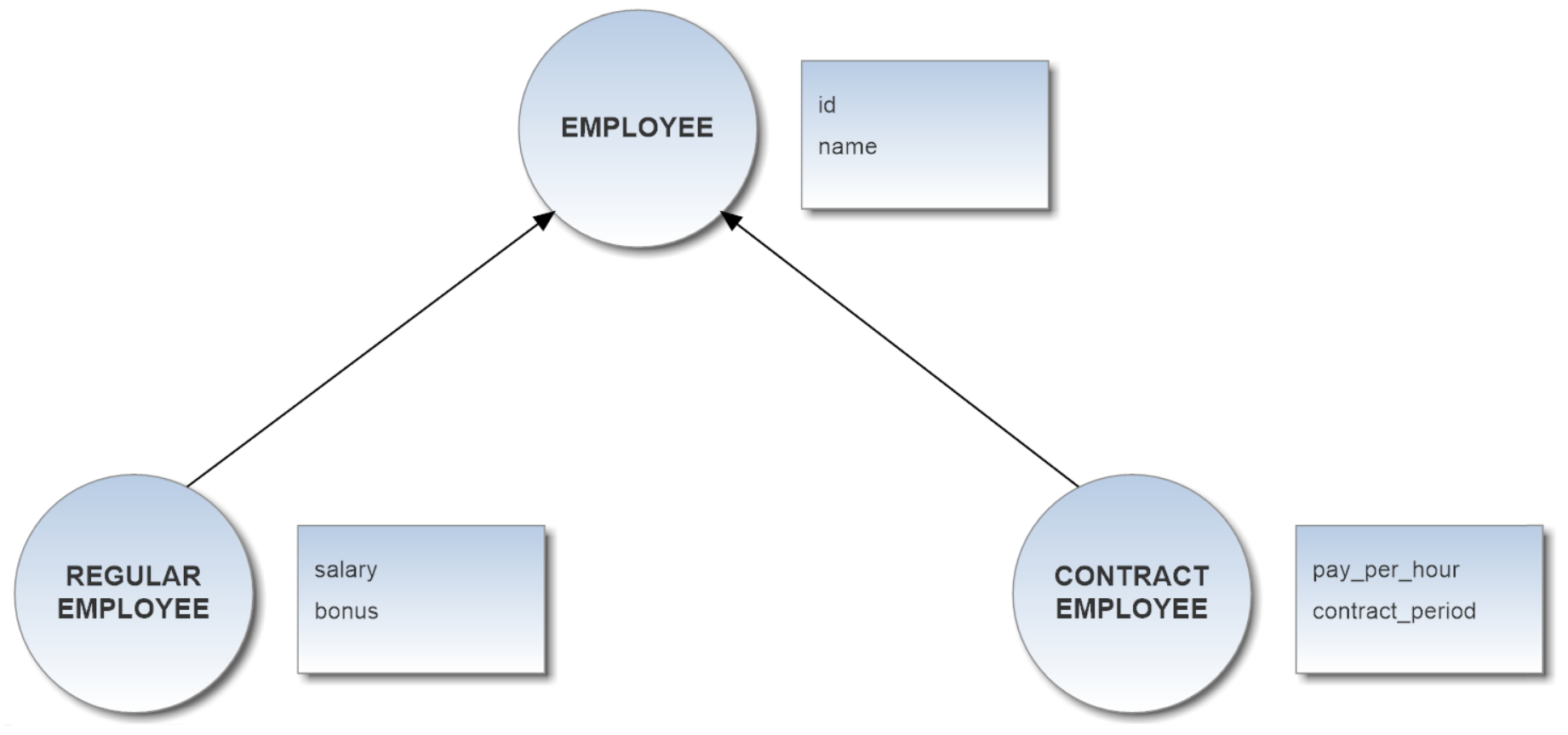 Now suppose you want to map the whole hierarchy given below into a coherent relational database schema. The Employee class is a superclass both for Regular_Employee and Contract_Employee classes. The type attribute acts as discriminator column.