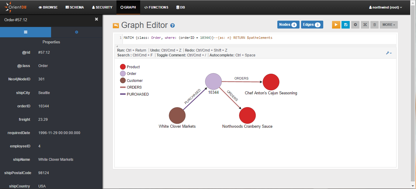 The following, instead, is the graph returned by the following MATCH query (the query returns all nodes connected to the Order with orderID 10344):